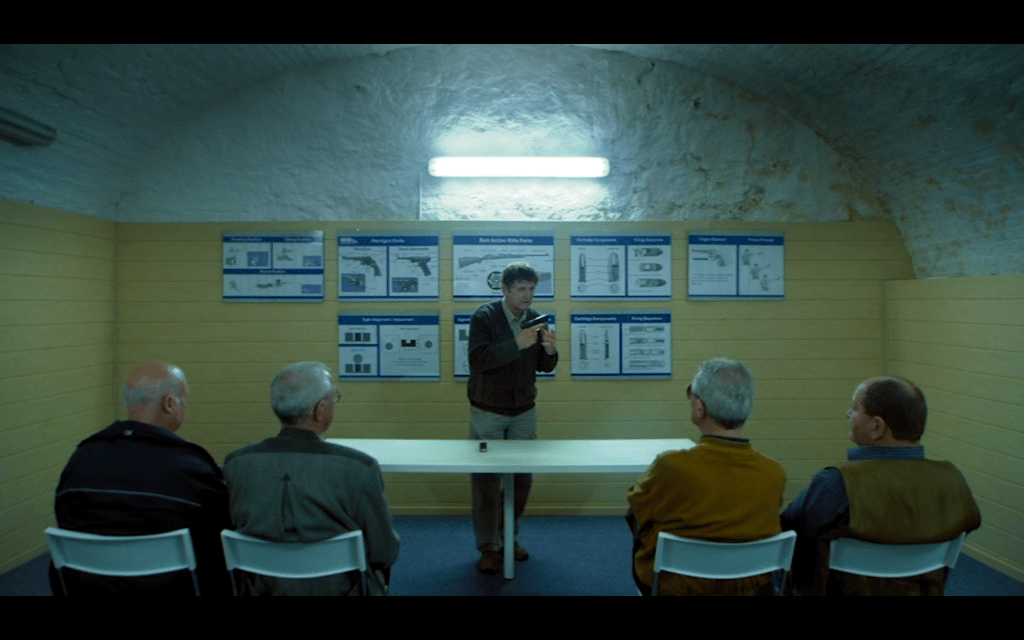 While we don’t get to learn all of the characters’ first names, the first one we meet is called Fritz, and he’s a firearm instructor. We see him welcoming a handful of silver-headed seniors who come to the basement-cum-shooting range to shoot both their weapons and mouths off. Politics is all they seem to want to talk about in Fritz’ basement.
