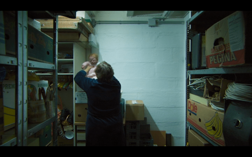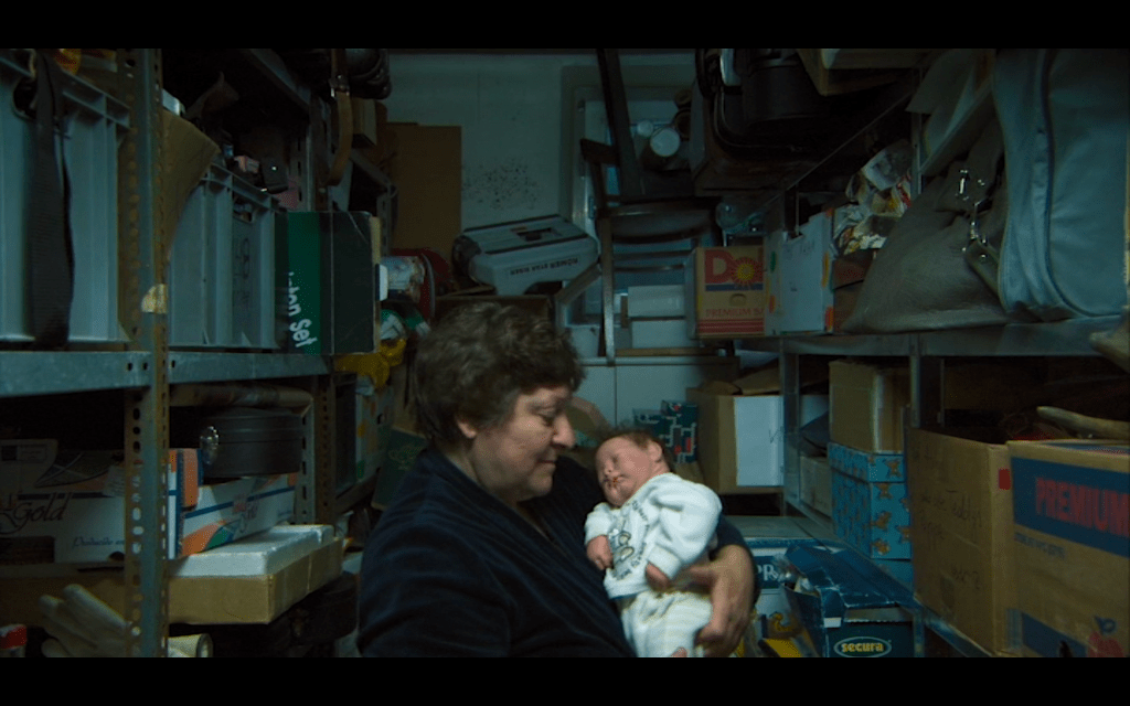 The third character we spend some quality time with is actually one of the most tragic. She is a woman on the wrong side of fifty who lives alone on the third floor of the apartment building. Every night she trudges down three flights of steps in her nightgown to her basement. Once inside, she locks the door. And in the privacy of her basement she pops a hyper-realistic baby doll out of a shoebox.